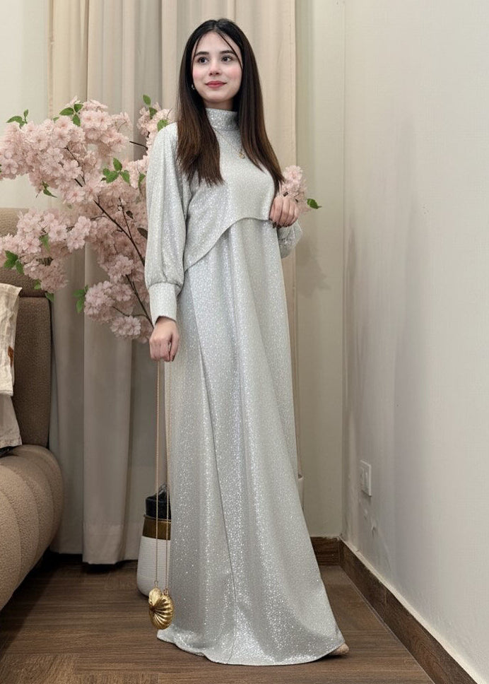Steal the spotlight with the Moonlight Glitter Cape & Maxi Set where celestial shine meets effortless grace.